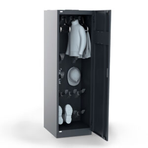 Dieser Trockenschrank bietet Platz für bis zu 4 vollständigen Ausrüstungen bestehend aus vier Helmen, acht Handschuhen, acht Stiefeln oder acht Schuhen und der Kleidung selbst. Der Trocknungsschrank für Helme ist mit einem Magnetverschluss, kleinen Gumminoppen im Türbereich und einem Öffnungsbegrenzer an der Tür ausgestattet. Dies macht ein leises sowie reibungsloses Öffnen und Schliessen des Schrankes problemlos möglich. Das Gehäuse des Trockenschranks für Kleidung und Helme 4 Warmluft ist aus sendzimirverzinktem Stahlblech gefertigt und zur Stabilität an den Ecken mehrfach vernietet. Zusätzlich sind die Scharniere der Türen aus hartverlötetem und robust verschweisstem Stahlblech gefertigt.